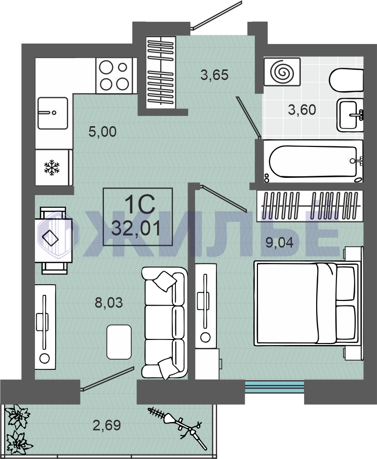 1-к квартира в ЖК «ЖК Энвилль», 32 кв.м., Алексея Маресьева, 37/1 (№107644)
