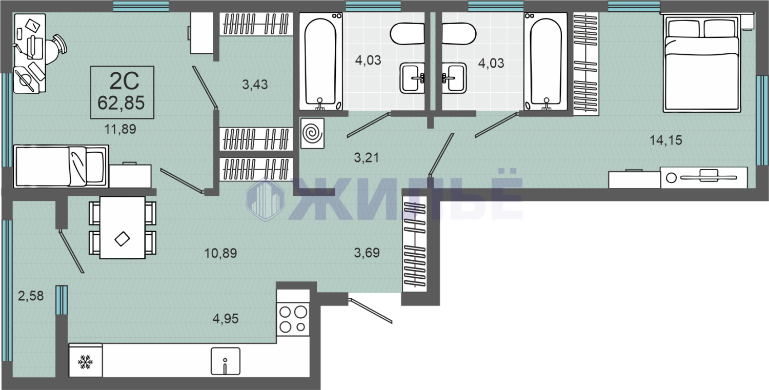 2-к квартира в ЖК «ЖК Энвилль», 62 кв.м., Алексея Маресьева, 37/1 (№106995)